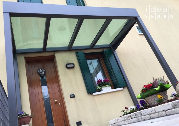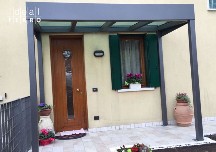 La pergola è stata realizzata in ferro zincato a caldo e verniciato; le travi interne sono in pendenza mentre i piatti esterni fanno in modo che la struttura sembri parallela al terreno. La grondaia è interna e lo scarico delle acque è convogliato nelle colonne portanti.