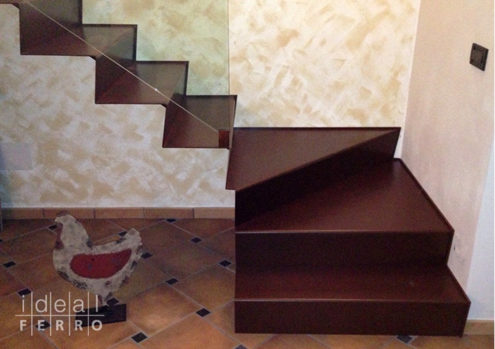 La scala rappresentata è stata realizzata con solo acciaio cor-ten ossidato; la finitura è ad olio che va tendenzialmente a scurire la superficie del metallo.